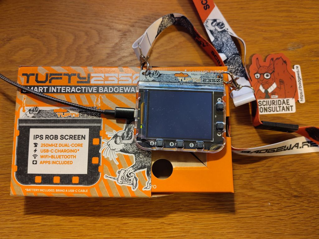 I pre-ordered a Badgeware Tufty, a “smart interactive badge with colour 2.8” TFT display, powered by Raspberry Pi RP2350." It arrived today! This post covers what I’ve learned so far about programming it.