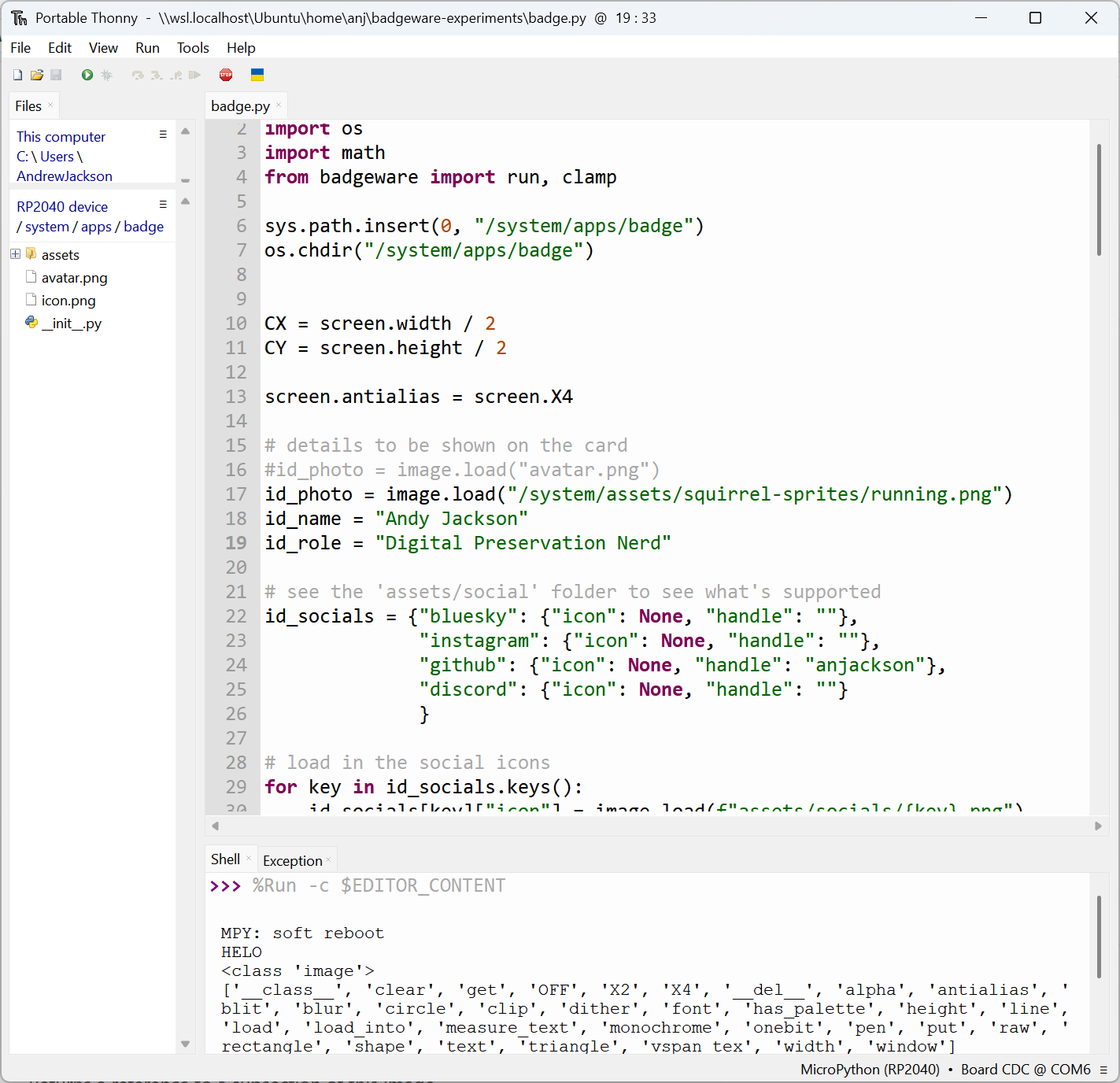 What didn’t work was writing the Python files directly to the device. I’ve had that work on other bits of kit, but that just crashed here. However, if you store the Python file on the host computer, you can still make it run on the Tufty over the USB connection! Here’s an example, where I’m modifying a copy of the supplied ‘mini apps’ where it acts like a conference badge: