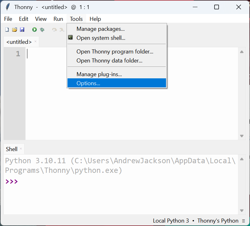 I installed Thonny on Windows 11, started it up, and went to configure it