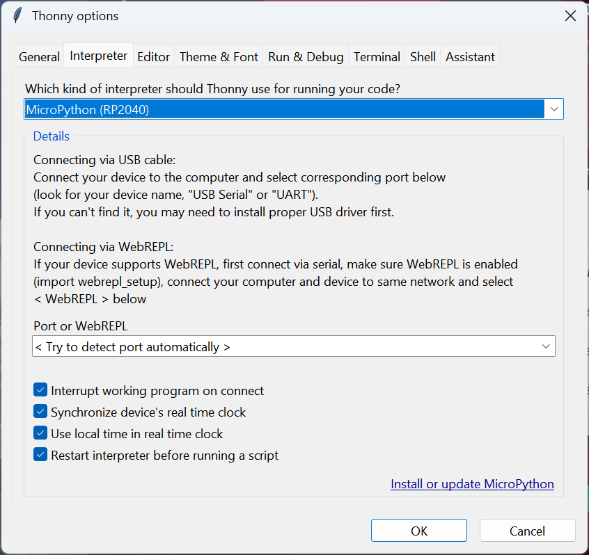 I then switched the Python Interpreter configuration to look for a device running “MicroPython (RP2040)”