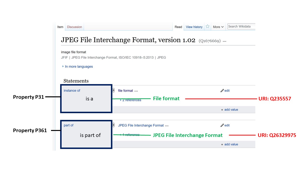 The core of the Wikidata data model (MediaWiki, 2021) consists of items and properties. Properties are used to express statements about items. In Figure 1, we see a screenshot of the Wikidata page for item: “JPEG File Interchange Format, version 1.02”. Each item is allotted a page in Wikidata and has a unique identifier, with prefix “Q” plus a string of numbers which is assigned to this item. The two properties “instance of” and “part of” are used to assert statements about the item. A claim and its references are a “statement”. Sets of properties are not pre-defined for classes in Wikidata. Editors may freely select properties to express statements on Wikidata items.